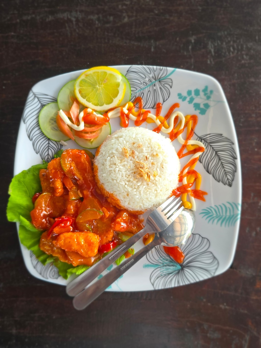 Crispy chicken chunks stir-fried in a rich, tangy sweet & sour sauce, served with fluffy white rice, fresh greens, and a zesty salad garnish. A well-balanced, colorful meal perfect for any time of day.
