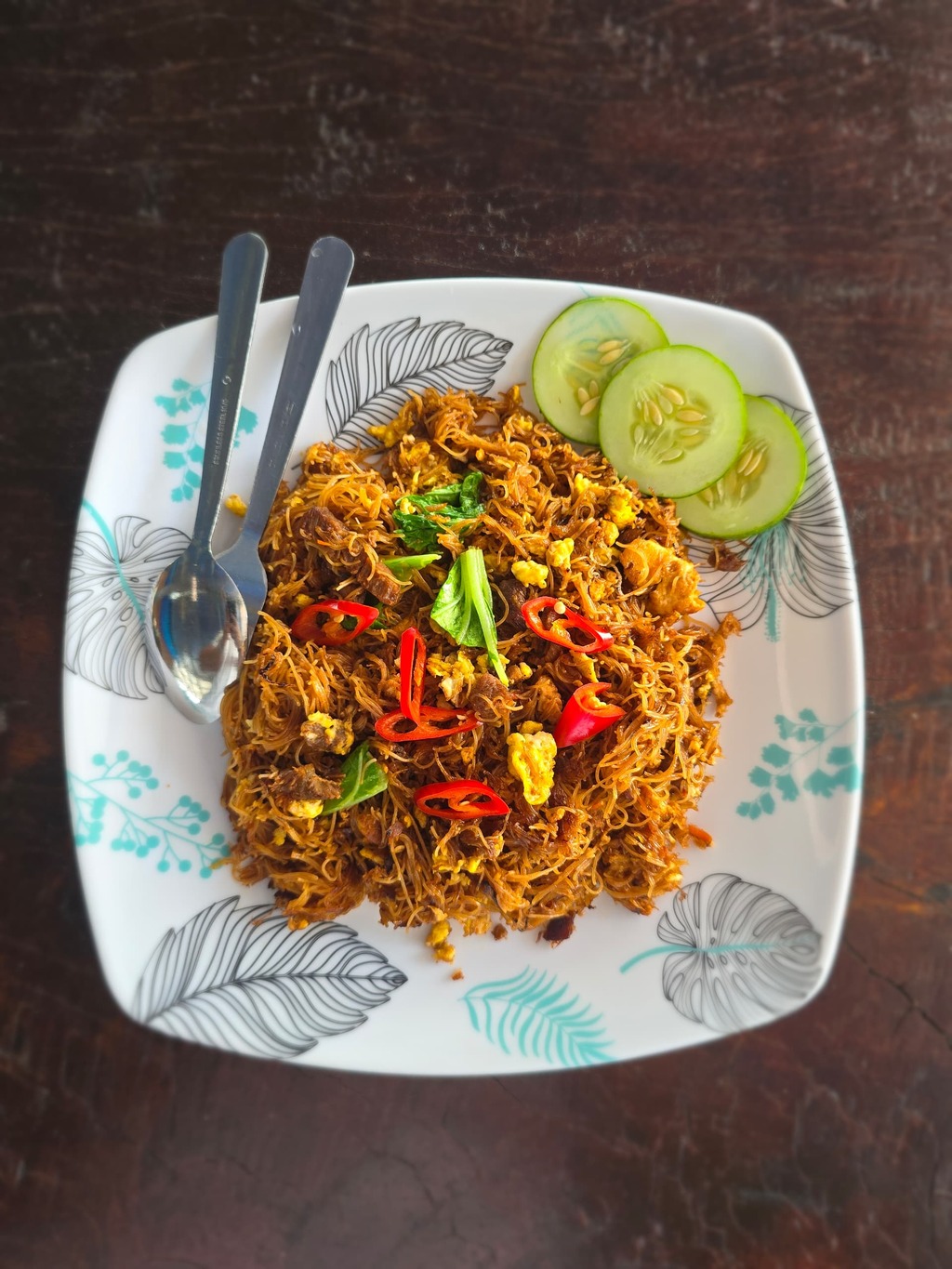 A flavorful stir-fry of vermicelli noodles with egg, vegetables, and a hint of spice. Served hot and garnished with fresh cucumber slices — a local comfort food perfect for breakfast, lunch, or tea time.